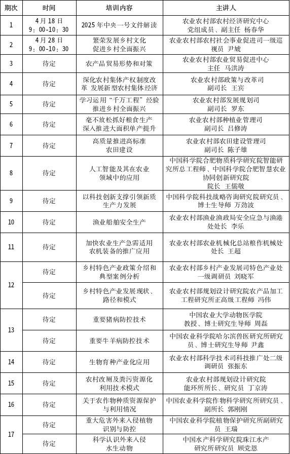 按照《农业农村部办公厅关于利用全国农业农村远程教育平台开展2025年农业农村科技人员知识更新培训的通知》统一部署,举办2025年度农业农村科技人员知识更新培训远程培训班17期。现将有关事项通知如下: